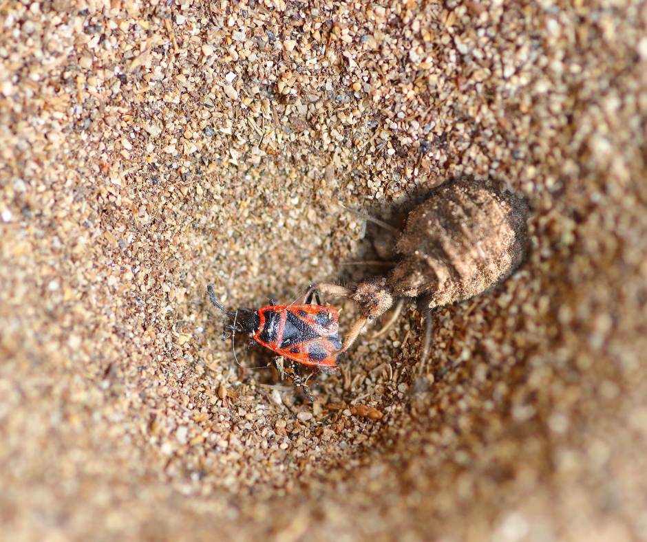 When they're not building pits, antlion larvae can bury themselves completely beneath the surface, lying in ambush with only their jaws visible. Unless you know what to look for, you’d never know a predator was right beneath your feet.