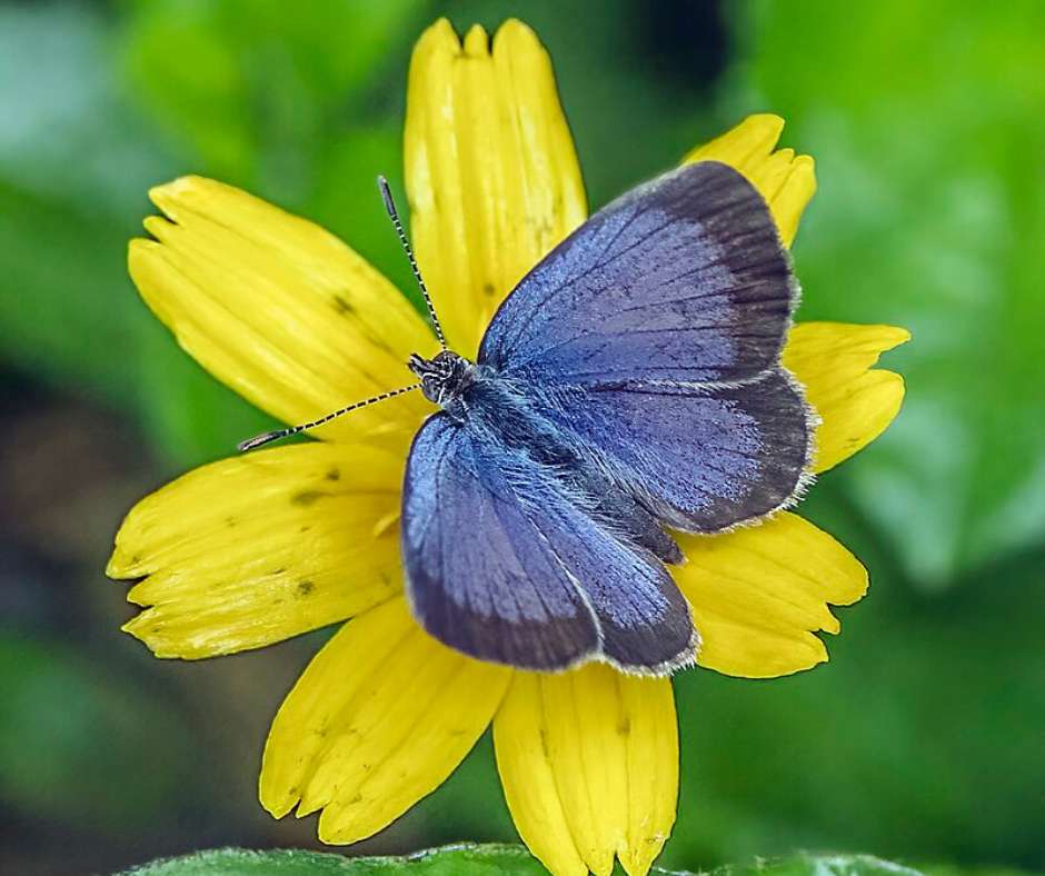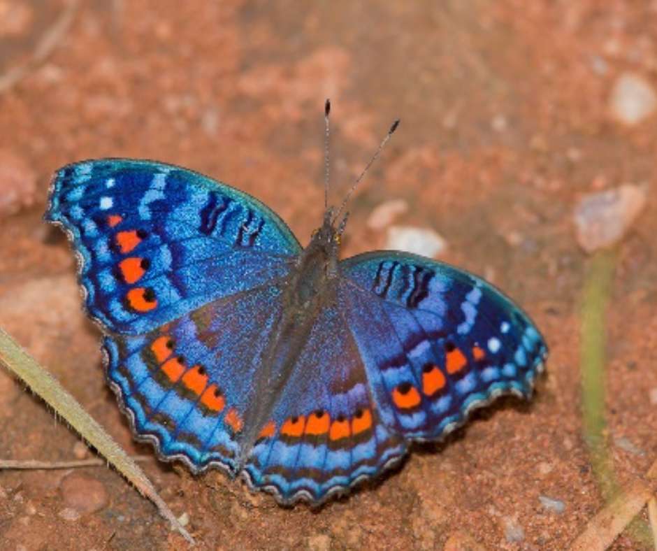 Blue Pansies are often seen resting on the ground with wings wide open, soaking up the sun. Males are territorial and will chase away rivals from their chosen patch of light. Females are more secretive, flying low to the ground when seeking host plants.
