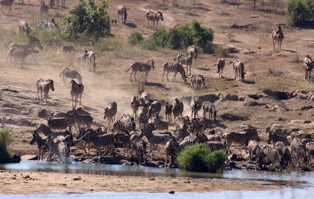 As the heat fades, twilight gatherings begin. Herds of zebra, buffalo, and elephant may converge at once — a swirl of dust, noise, and tension.