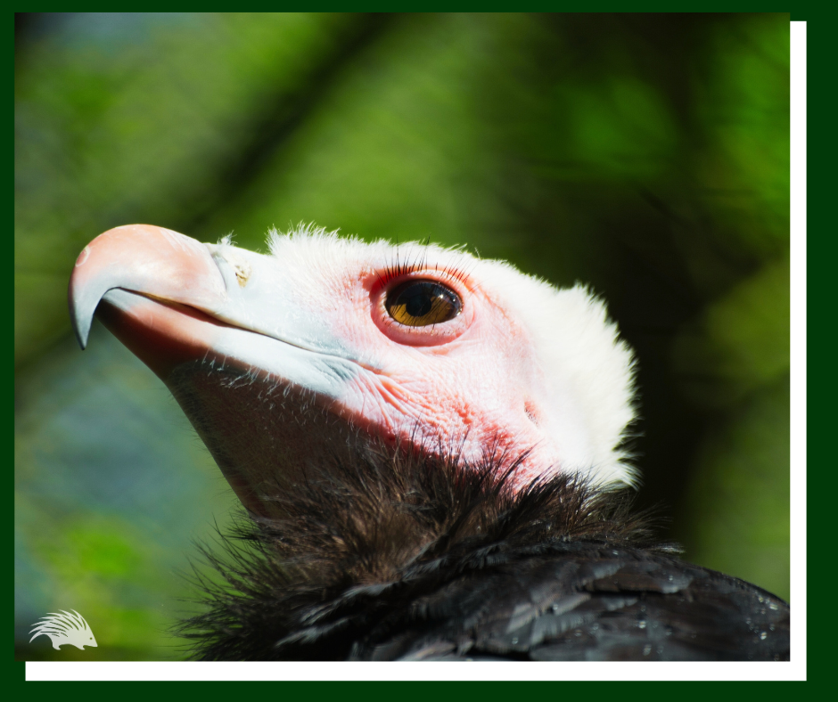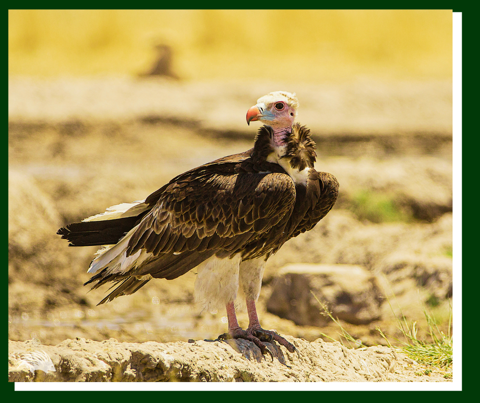 The white-headed vulture is striking — white head, orange-red bill, and a bold patterned body. It is one of the first vultures to arrive at a kill and one of the most territorial. It is also classified as critically endangered.